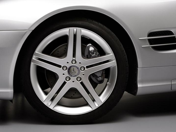 The new large 19-inch wheels (8.5 inches at the front with 255/35 ZR19 Y tyres, 9.5 inches at the rear with 285/30 ZR19 Y tyres) are the most striking visual feature and deftly underscore the extra-special status of the SL-Class with sports package. Their sensational, newly devised design comprising five twin spokes with very straight lines and a hubcap cover featuring the Mercedes star and laurel wreath instantly attracts the gaze of any onlookers. The wheels' visual impact is reinforced by the fact that they afford an unimpeded view of the attractively styled front brake callipers, which have been specially painted in silver for the sports package and marked with the Mercedes-Benz lettering. The high-performance brake system lives up to these sensational looks, assisted by perforated brake discs at the rear wheels too. Dark-tinted tail light units form a further distinguishing feature.